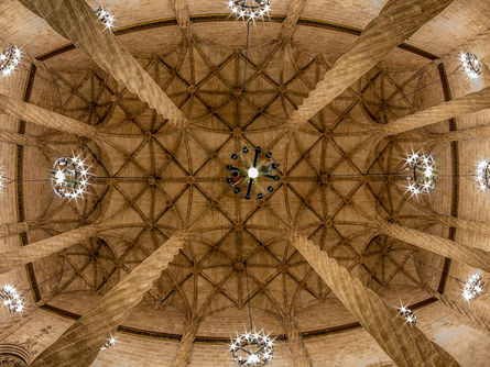 El salón columnario está dividido en tres naves longitudinales y cinco transversales, en función de las ocho columnas exentas que soportan las bóvedas. Su altura de 17,40 metros transmite una singular monumentalidad a las columnas helicoidales –a modo de amarras de barco o madejas de seda- que, como palmeras mediterráneas, se abren al llegar al techo para convertirse en las nervaduras de las bóvedas, en su tiempo pintadas de azul con estrellas de pan de oro.