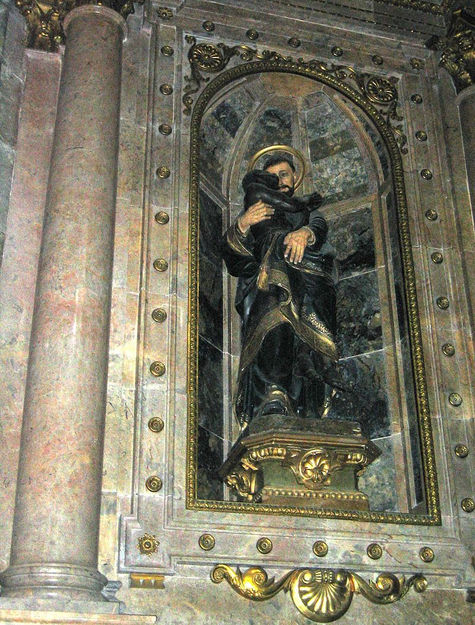 La casa de Austria fue la impulsora de la construcción del santuario, pero este se realizó bajo la dinastía de los Borbones. Por ello sobre el pórtico se ubica un gran escudo de los Borbones. Bajo el techo en el pórtico se hallan las estatuas de san Ignacio, san Francisco Javier, san Francisco de Borja, san Luis Gonzaga y san Estanislao de Kostka realizadas por el escultor italiano Gaetano Pace y por el cántabro Miguel de Mazo, a quien se le encargó la finalización del proyecto a la muerte de Pace en 1738.