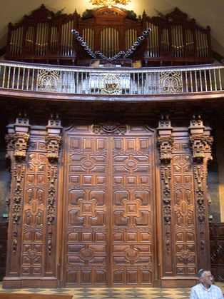 Las puertas principales son de madera de cedro del Líbano que se complementa, en el resto de la instalación, con madera de caoba. El conjunto de acceso está flanqueado por dos columnas salomónicas a las que corona un frontón curvo partido.