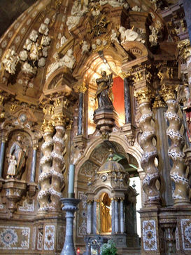 En el interior, el churrigueresco lo inunda todo. Está realizado en mármol con mucho dorado, con un piso del mismo material dibujando un gran mosaico.