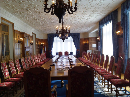 Hoy la primera planta está dedicada a salas de conferencias modernamente equipadas, con salas de traducción, proyectores, etc. También disponen de comedor.