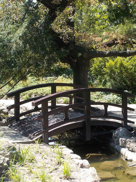Un pequeño jardín japonés con un estanque termal de peces en el centro,